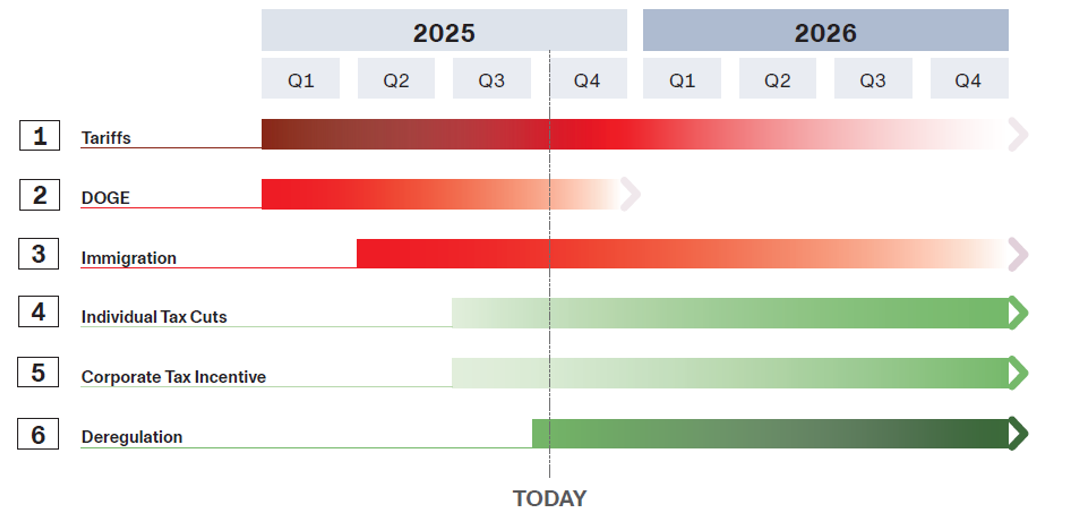 Comme le montre l’illustration ci-dessus, les effets négatifs initiaux de certaines politiques de l’administration Trump devraient donc être remplacés au fil du temps par des impacts nettement positifs pour l’activité économique. Un certain optimisme prudent se justifie donc pour l’année prochaine et le spectre de la récession semble bel et bien s’éloigner.