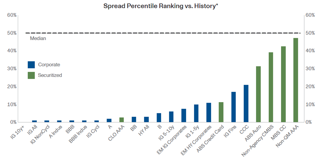 Sources: Bloomberg, TCW. * Les spreads sont calculés sur la base des données historiques disponibles pour les segments et périodes suivantes: Agency MBS (2000), ABS Credit/Auto (2002), Corporates (2000), CMBS (2008), CLOs (2011), Non-QM AAA (2017), EM (2001).