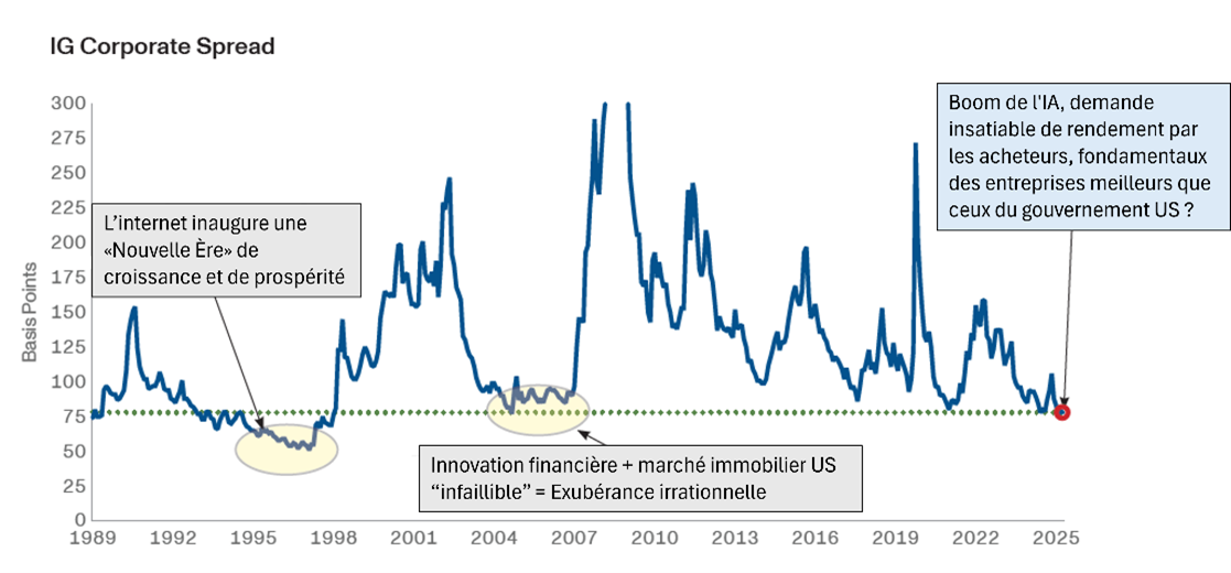 Concrètement, cela signifie que le marché n’offre pratiquement aucune compensation ni pour le risque de défaut, ni pour la volatilité potentielle. Certes, la probabilité de défaut des entreprises dites « Investment Grade » est généralement extrêmement faible, de sorte que le spread de ces emprunts correspond essentiellement à une prime de liquidité et de volatilité, qui compense les investisseurs pour la détention d’obligations d’entreprises par rapport aux bons du Trésor américain.
